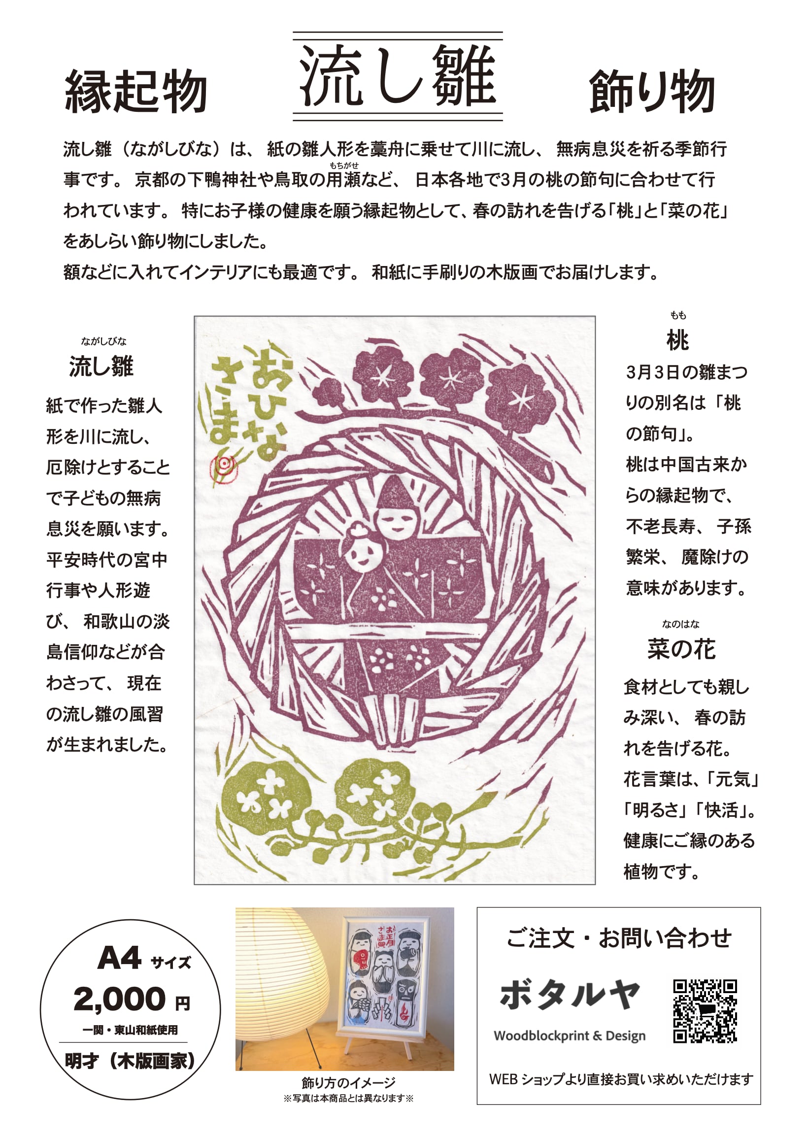 流し雛(ながしびな)は、紙の雛人形を藁舟に乗せて川に流し、無病息災を祈る季節行事です。京都の下鴨神社や鳥取の用瀬など、日本各地で3月の桃の節句に合わせて行われています。特にお子様の健康を願う縁起物として、春の訪れを告げる「桃」と「菜の花」をあしらい飾り物にしました。